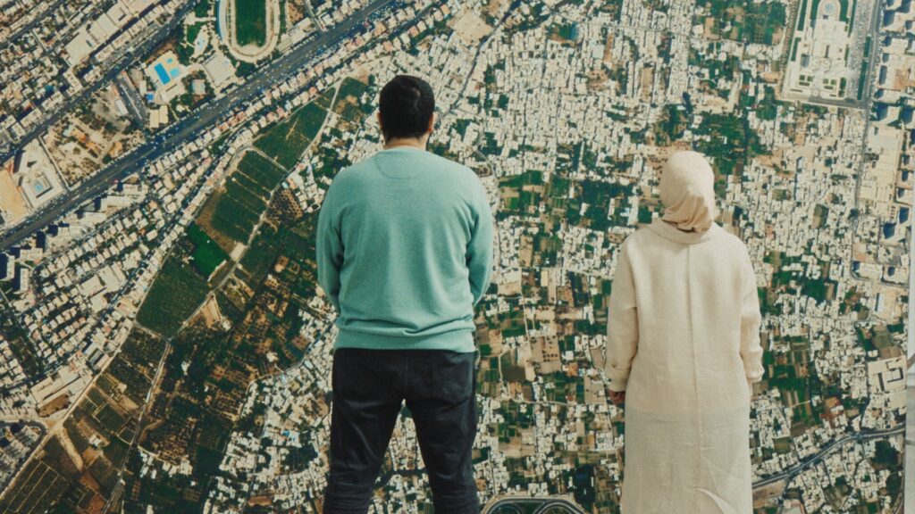 How can you conduct an exercise in psychogeography in the very absence of the space itself? In THE ORCHARDS, two individuals recall the existence of a place wiped off the face of the earth—the eponymous neighborhood in Damascus, destroyed in 2011 as punishment for its protests and uprisings against the Bashar al-Assad regime. Antoine Chapon alternates between warm, natural memories of an area famous for its orchards, and pixelated testimonies from the time of its destruction, balancing them against computer-rendered images of the “grand” building project designed not only to replace the old neighborhood, but to erase all traces of what came before. For this cityscape of the future, planning does not mean rebuilding, but sanitizing and normalizing. If in the early days of skyscraper construction they were the symbol of a new world, within the architecture of the present the glassy facades of skyscrapers are but a hall of mirrors deflecting from massacres, exploitation, and abusive regimes. Yet Chapon wonders, could technology not also rebuild other kinds of worlds? What if political graffiti and other elements of the real world purposely excluded from architectural plans could find their way into these sterile mock-ups? (Dora Leu)